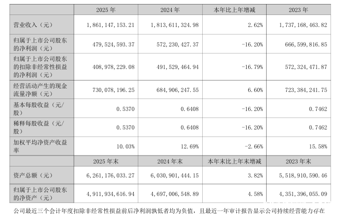 3月28日,欧普康视科技股份有限公司(300595.SZ 以下简称“欧普康视”)交出了其2025年的成绩单。报告期内,公司实现营业收入18.61亿元,归母净利润4.79亿元,同比下滑16.20%。相较2024年归母净利润14.16%的降幅,2025年利润端压力进一步加剧。