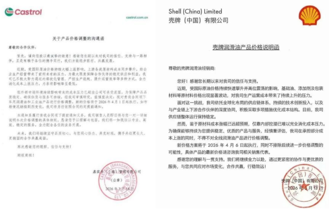 壳牌中国公告称,受国际原油价格持续快速攀升并高位震荡的影响,基础油、添加剂及包装材料等原材料价格出现显著波动,对公司生产运营成本带来了持续上升的压力。鉴于原材料成本涨幅已远超预期,仅靠内部挖潜已难以完全消化成本压力。公司在承担部分成本上涨的同时,对全线润滑油产品进行价格调整。据介绍,新价格方案将于2026年4月6日起执行,同时不排除后续进一步价格调整的可能性。