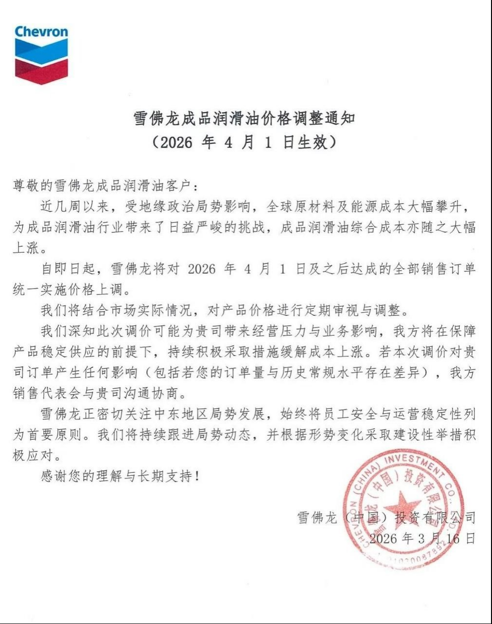雪佛龙中国表示,受地缘政治局势影响,全球原材料及能源成本大幅攀升,为成品润滑油行业带来了日益严峻的挑战,成品润滑油综合成本亦随之大幅上涨。雪佛龙将对2026年4月1日及之后达成的全部销售订单统一实施价格上调。